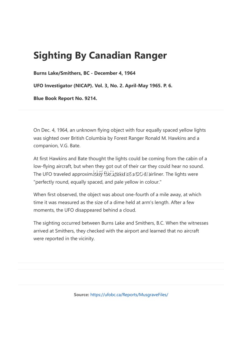 On December 4, 1964, Forest Ranger Ronald M. Hawkins and his companion, V.G. Bate, observed an unidentified flying object while traveling between Burns Lake and Smithers, British Columbia. The object was initially perceived as having four equally spaced yellow lights, which the witnesses first speculated might be the cabin lights of a low-flying aircraft. Upon exiting their vehicle, the witnesses noted that the object made no sound. The object was described as having perfectly round, pale yellow lights and was estimated to be traveling at the speed of a DC-6 airliner. At the time of the initial observation, the object was approximately one-fourth of a mile away and appeared to be the size of a dime held at arm's length. The sighting concluded when the object disappeared behind a cloud. Upon arriving in Smithers, the witnesses contacted the local airport and were informed that no aircraft had been reported in the vicinity at that time. This incident was documented in Blue Book Report No. 9214 and subsequently featured in the April-May 1965 issue of the NICAP UFO Investigator.