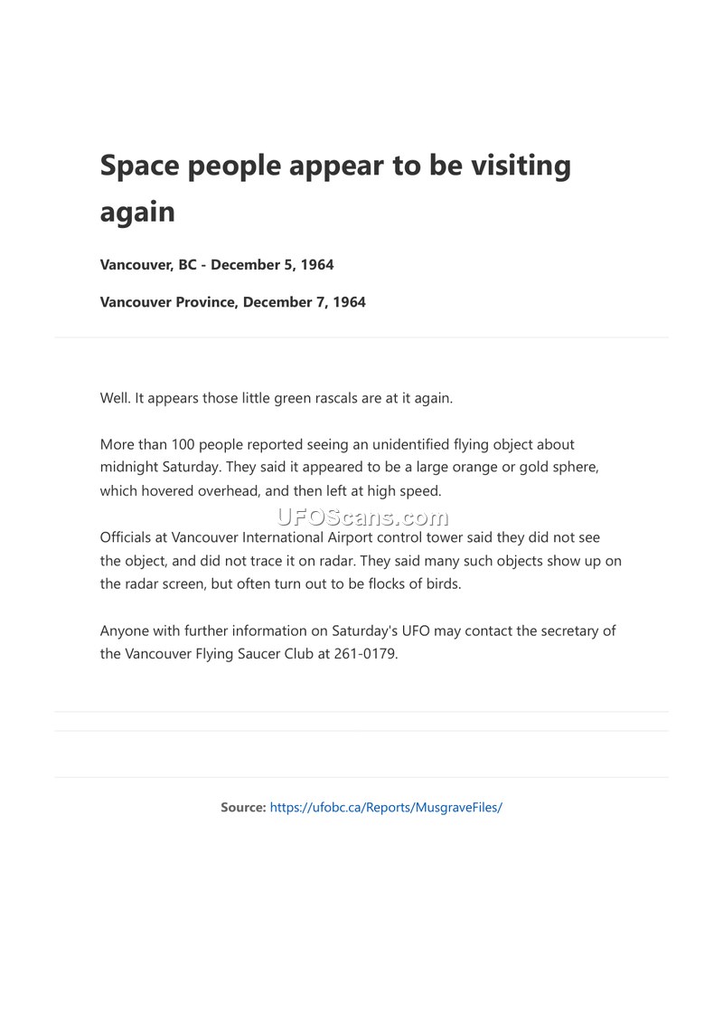 On December 7, 1964, the Vancouver Province reported on a UFO sighting that occurred on the night of Saturday, December 5, 1964. According to the report, over 100 witnesses observed a large orange or gold sphere hovering over the area around midnight before it departed at a high rate of speed. Despite the significant number of reports from the public, officials at the Vancouver International Airport control tower stated that they did not observe the object visually, nor did they detect it on their radar systems. The airport officials noted that while unidentified objects frequently appear on their radar screens, they are often identified as flocks of birds. The article concludes by inviting members of the public who have further information regarding the event to contact the secretary of the Vancouver Flying Saucer Club.