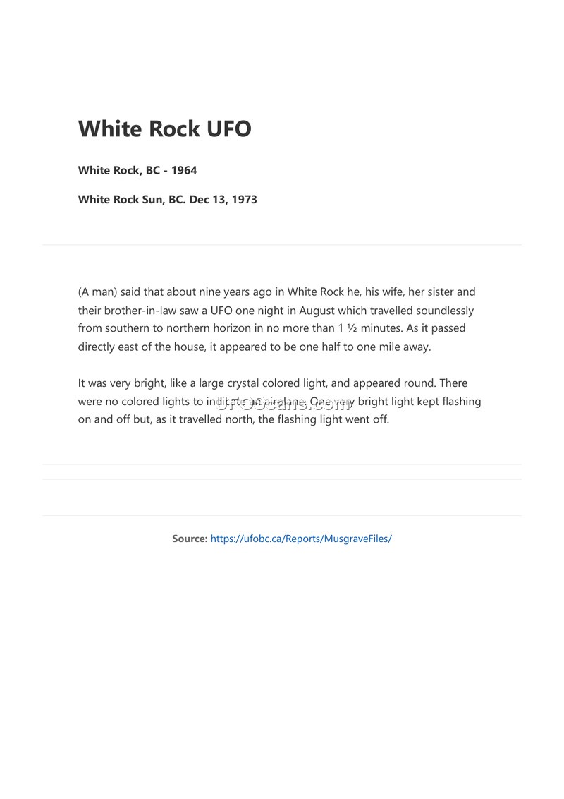 A 1973 press report details a 1964 UFO sighting in White Rock, BC, involving four witnesses. The object was described as a soundless, round, crystal-colored light that traveled across the horizon in under 90 seconds.
