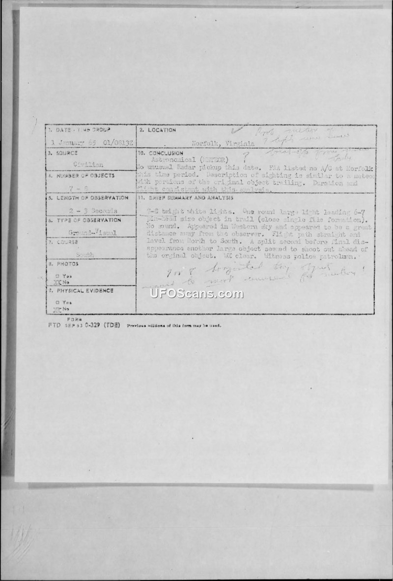 This document is an official Air Force investigation report regarding a UFO sighting that occurred in Norfolk, Virginia, on 1 January 1965. The witness, a patrolman with the Norfolk Police Department, observed seven or eight bright, round, white lights in a single-file formation while standing near a hamburger stand on Granby Street. The objects were estimated to be between 3,000 and 6,000 feet in altitude and moved in a straight, level path from south to north. The entire event lasted only two to three seconds, during which a larger object appeared to 'shoot ahead' of the others before the formation disappeared. The report notes that the witness only came forward after hearing news reports about radar-tracked UFOs at Patuxent River Naval Air Station in late December 1964. Military investigators conducted a thorough check of local radar sites, including the Oceana Naval Air Station, and found no unusual activity. The FAA also confirmed no air traffic was under their control in the area at the time. Meteorological data provided by the Fleet Weather Facility and the Norfolk Weather Bureau identified a temperature inversion between 1,500 and 1,850 feet. Based on this, the official conclusion reached by First Lieutenant Robert R. Dockum was that the sighting was likely caused by ground lights reflecting off the atmospheric inversion layer. No physical evidence was found, and no interception was attempted due to the one-day delay in the report reaching the Navy.