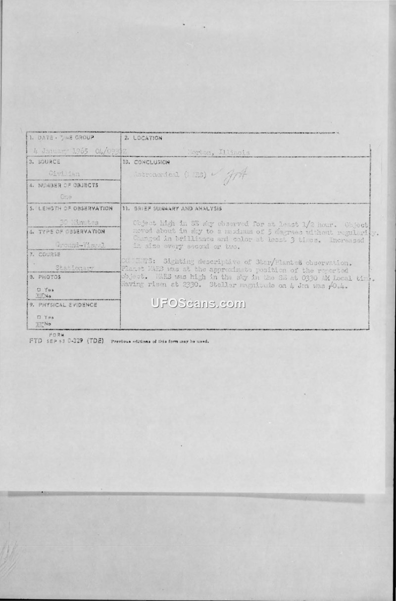 A civilian report of an unidentified object in Morton, Illinois, was investigated by Project Blue Book. The Air Force concluded the object was the planet Mars.