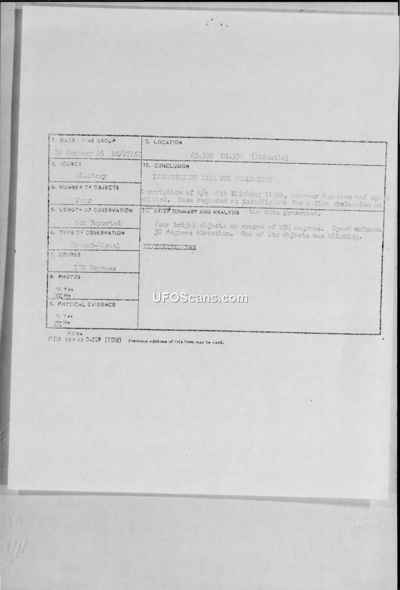A military message from 1965 reports the sighting of four bright, unidentified objects over the Atlantic. The case was officially closed as having insufficient data for evaluation.