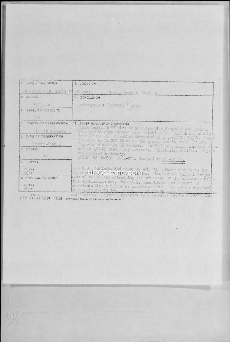 On 10 January 1965, at 1555Z, a family in Silver Spring, Maryland, observed a round object, approximately half the size of an automobile, emitting a bright white light and dropping red sparks. The witnesses, who were watching television at the time, initially believed the object was an aircraft on fire. The object appeared from nowhere, traveled in a straight line from the northwest to the southeast at an altitude of 200 feet, and then disappeared instantly. The observation lasted between 5 and 10 seconds under overcast sky conditions with 4 miles of visibility. The report was processed by the 1001st Air Base Wing at Andrews AFB. While initial internal notes considered the possibility of an aircraft with an afterburner, this was dismissed due to the object's brightness. The final official conclusion categorized the event as a probable meteor observation, referencing the decay of object US OBJ954 (1964-87A) on 11 January 1965.