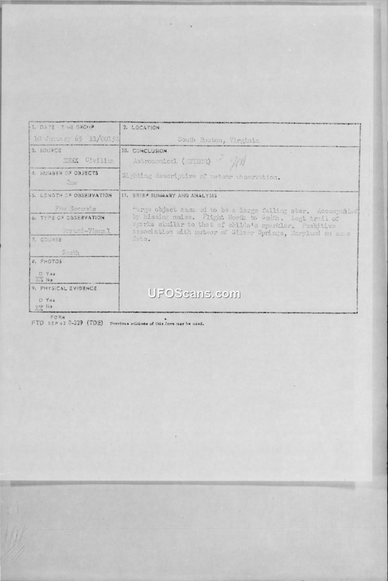 The Air Force investigated a January 1965 sighting in South Boston, Virginia, reported by two witnesses. The official conclusion was that the object was a meteor.