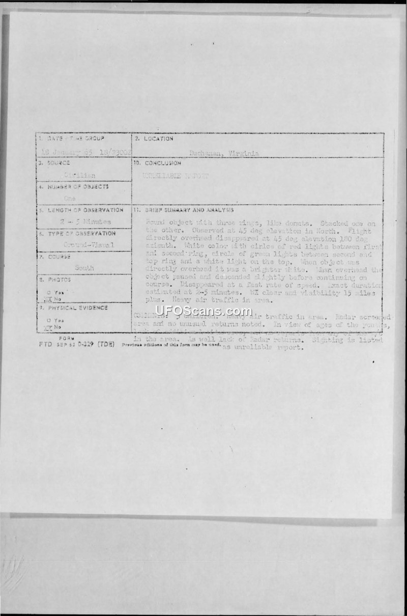 On 18 January 1965, at approximately 2300Z, three children in Buchanan, Virginia, observed an unidentified aerial object. The witnesses described the object as round, consisting of three stacked rings resembling donuts, with a dome-shaped top. The object was initially observed as small, appearing like a pea, but grew to the size of a basketball when directly overhead. It displayed a white color with a circle of red lights between the first and second rings, a circle of green lights between the second and third rings, and a white light on top. The object, which appeared brighter white when overhead, paused momentarily, descended slightly, and then ascended while continuing its flight path to the south at a high rate of speed. The total duration of the sighting was estimated at two to five minutes. The weather was clear with visibility exceeding 15 miles. Following the report, the 649th Radar Squadron at Bedford AFS, Virginia, conducted a search of the area using an AN/FPS-6 height finder radar in manual mode, but no abnormal airborne objects were detected. The mother of two of the children confirmed that no information had been released to news agencies and that the children were excited when they first arrived home. Major Hector Quintanilla, Jr., Chief of the Aerial Phenomena Branch, concluded that the report was unreliable. He noted that while he did not wish to question the veracity of the children, the lack of corroborating evidence, the absence of radar returns, and the ages of the witnesses meant the facts were insufficient to form a definitive evaluation.