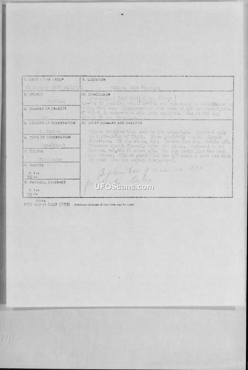 UFO Sighting Report — Elkins, West Virginia, 22 January 1965