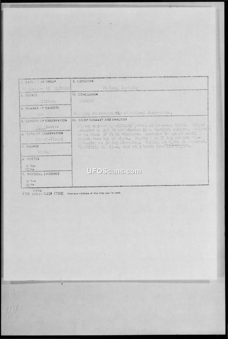 Military police at Fort Knox reported a 22-minute sighting of a glowing, 50-foot diameter object that ascended in a spiral pattern. The official Air Force conclusion identified the object as a balloon.