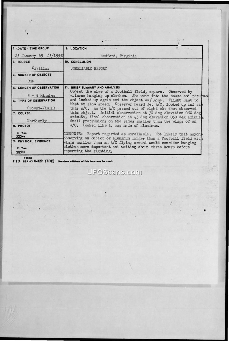A civilian witness in Bedford, Virginia, reported a large, square, aluminum-like object on January 25, 1965. The Air Force officially deemed the report unreliable due to the witness's delayed reporting.