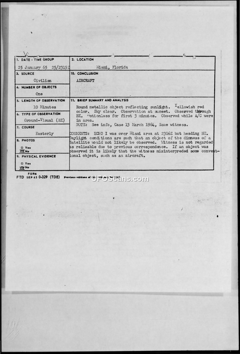 A civilian in Miami reported a round, metallic object on 25 January 1965. Project Blue Book investigators concluded the sighting was likely a misidentified aircraft, noting the witness's history of unreliable reports.