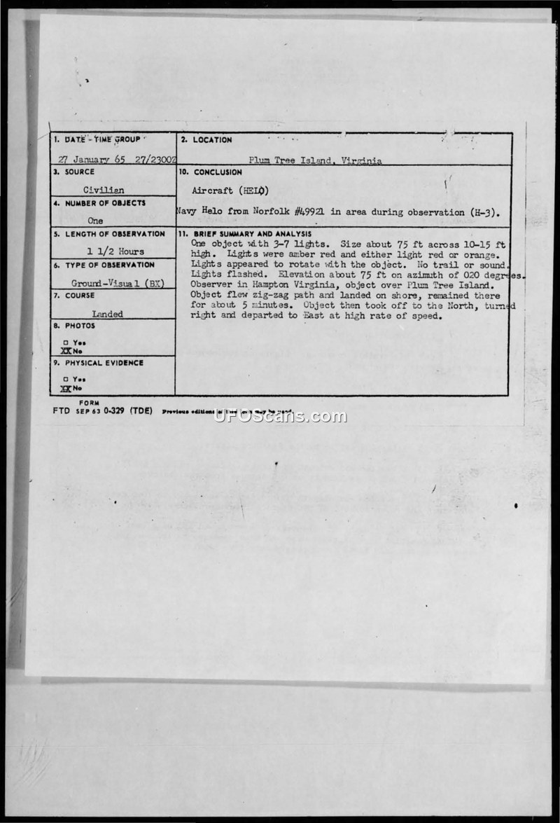 An Air Force investigation into a 1965 UFO sighting near Plum Tree Island, Virginia, concluded that the object was likely a Navy H-3 helicopter. The report documents the witness's observation of flashing lights and maneuvers, which were ultimately attributed to military air traffic.