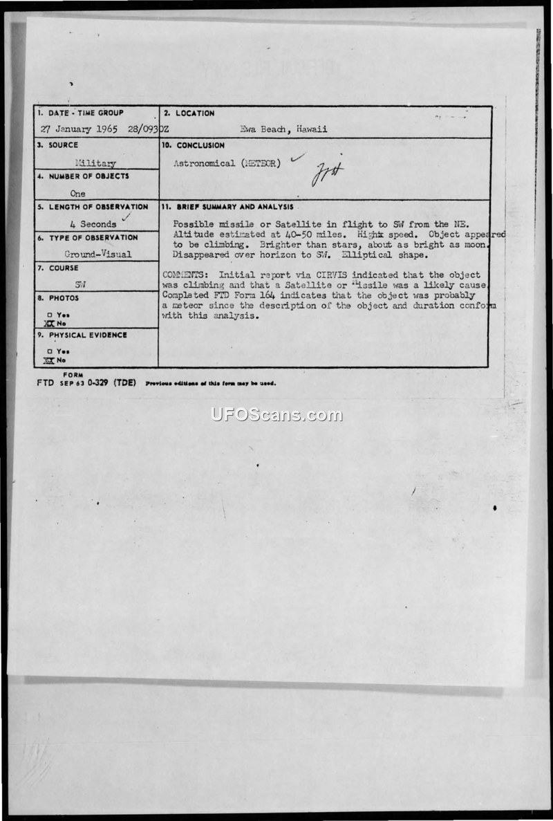 A control tower operator in Hawaii reported a high-speed, elliptical object on 27 January 1965. The Foreign Technology Division investigated the report and concluded the object was likely a meteor.