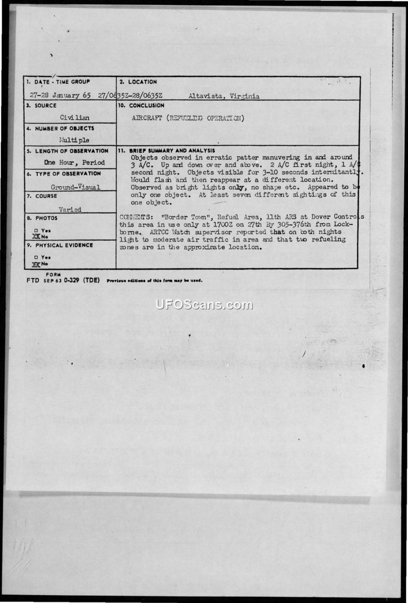 A civilian witness in Altavista, Virginia, reported erratic lights maneuvering near aircraft over two nights in January 1965. Air Force investigators concluded the sightings were likely military aircraft conducting refueling operations in the area.