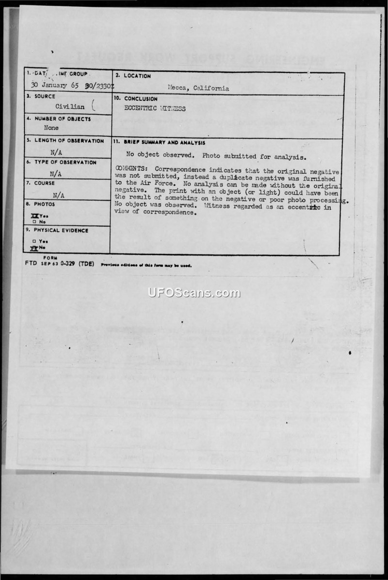 This document collection details the administrative handling of a UFO sighting report submitted by a civilian from Beaumont, California, in early 1965. The civilian submitted photographs and slides of an alleged Unidentified Flying Object, which he claimed were taken on February 7, 1965, near Mecca, California. The witness, described by Air Force personnel as an 'eccentric,' claimed to have heard a 'rumbling thunder sound' after taking the photo, though he did not see the object at the time. The Air Force, specifically the Foreign Technology Division and the Project Blue Book office, requested the original negatives for analysis. The witness failed to provide the originals, instead sending duplicates and engaging in extensive, often erratic, correspondence with the Air Force and the Federal Bureau of Investigation. The official Air Force conclusion was that no object was observed and that the images were likely the result of poor photo processing or artifacts on the negative. The file also contains a separate, unrelated report from an amateur astronomer in Rome, Italy, who claimed to have observed three luminous objects on January 31, 1965, and provided detailed, albeit speculative, calculations regarding their speed and altitude. The collection highlights the bureaucratic process of the Air Force in managing civilian UFO reports, emphasizing the requirement for original photographic evidence and the dismissal of reports deemed to lack credibility.
