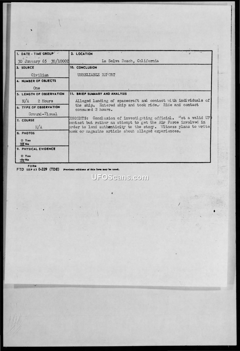 Unidentified Flying Object Report — La Selva Beach, California, 30 January 1965
