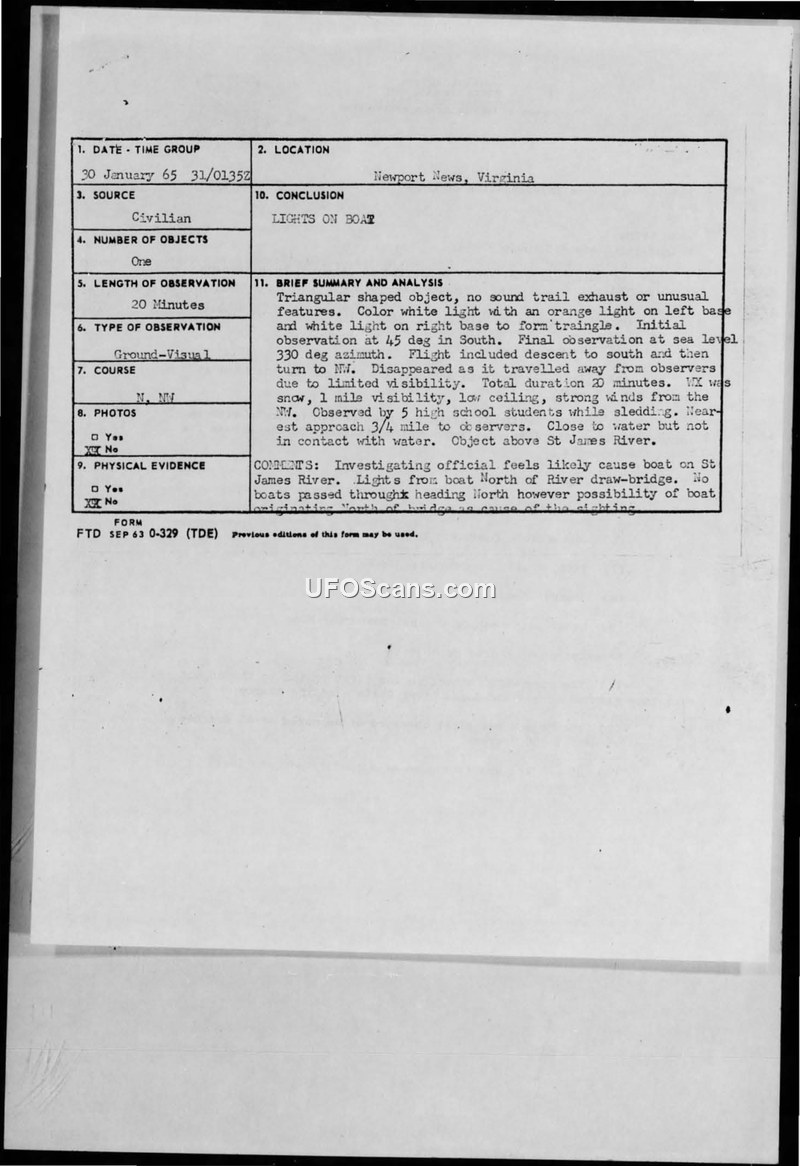 On 31 January 1965, at 0135Z, five high school students observed a triangular object while sledding near the James River Country Club in Newport News, Virginia. The object was described as having a white light at the apex, an orange light on the left base, and a white light on the right base. The witnesses reported that the object had no sound, trail, or exhaust. The observation lasted approximately 20 minutes, during which the object descended toward the south and then turned toward the northwest before disappearing due to limited visibility. The weather at the time was characterized by low ceilings, snow, and strong winds from the northwest, with visibility limited to approximately one mile. The object was estimated to be about 3/4 of a mile away at its closest point and appeared to be close to the water but not in contact with it. Captain William L. Bishop of the 4500th Air Base Wing conducted a personal interview with two of the students on 2 February 1965. The investigation concluded that the object was likely a boat on the St. James River. The investigating officer noted that while the draw-bridge operator reported no vessels heading upstream at the time, the relative slow movement of the object and the potential for the many lights in the Hampton Roads area to produce optical illusions through the blowing snow supported the boat hypothesis. The report explicitly states that there was no physical evidence, no radar contact, and no interception of the object.