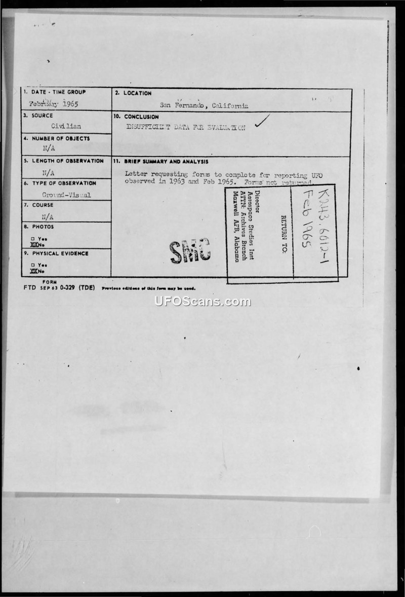 Correspondence regarding UFO sighting reports — San Fernando, California, 1965