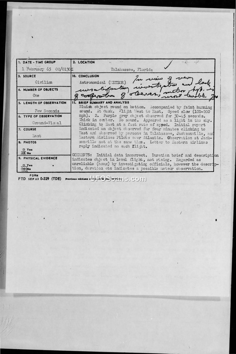 Unidentified Flying Object (UFO) Report — Tallahassee, Florida, February 1965