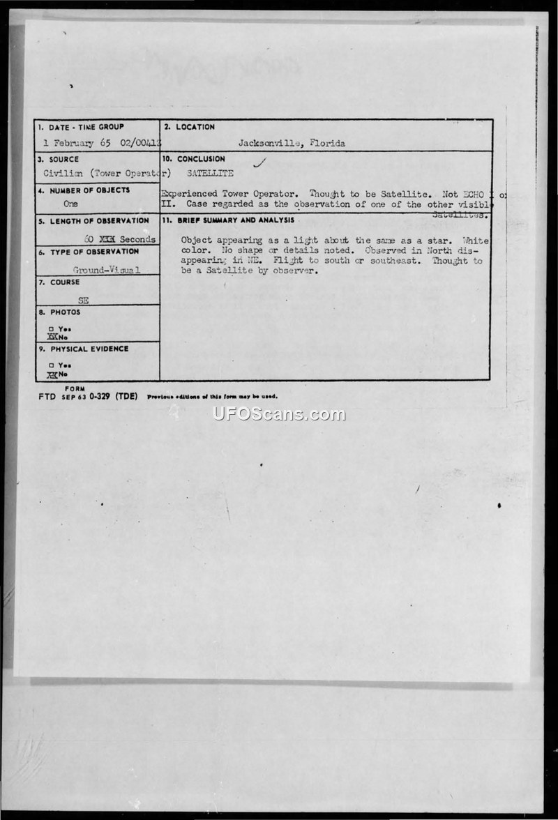 An experienced air traffic controller in Jacksonville, Florida, reported a white, star-like object moving across the sky on February 1, 1965. The Foreign Technology Division concluded the object was an artificial satellite.