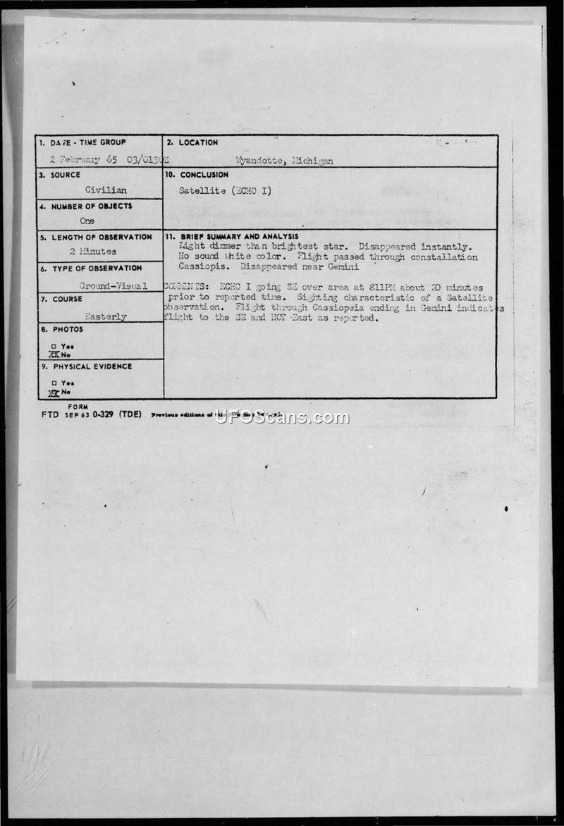 This document contains a series of correspondence and a formal sighting report regarding an unidentified aerial phenomenon observed by a 14-year-old amateur astronomer in Wyandotte, Michigan, on February 2, 1965. The witness reported observing a blue-white, round object with a highly polished metal surface moving in a west-east direction, which disappeared instantly near the constellation Gemini. The witness, who expressed a strong interest in astronomy, initially reported the sighting to the Air Force and subsequently sent multiple follow-up letters expressing frustration over the delay in receiving an official response. The Air Force, through Project Blue Book, investigated the report and concluded that the object was the ECHO I satellite. Official correspondence from Major Maston M. Jacks and Lt. Colonel John P. Spaulding confirmed this identification, noting that the object's trajectory through the constellations Cassiopeia and Gemini was consistent with the satellite's path, and that the witness's report of an eastward movement was likely a misinterpretation of its actual southeast trajectory. The file includes the original sighting questionnaire, the witness's hand-drawn sketches of the object's path, and the subsequent administrative correspondence between the witness and the Air Force.