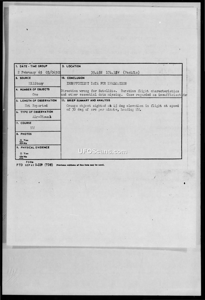 A military CIRVIS report from February 1965 documents the sighting of an orange object in the Pacific. The case was closed as having insufficient data for evaluation.