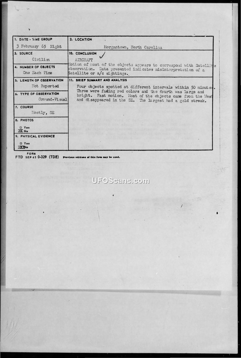 A civilian reported four fast-moving objects in Morgantown, NC, on February 3, 1965. The Air Force concluded the objects were likely satellites or aircraft.