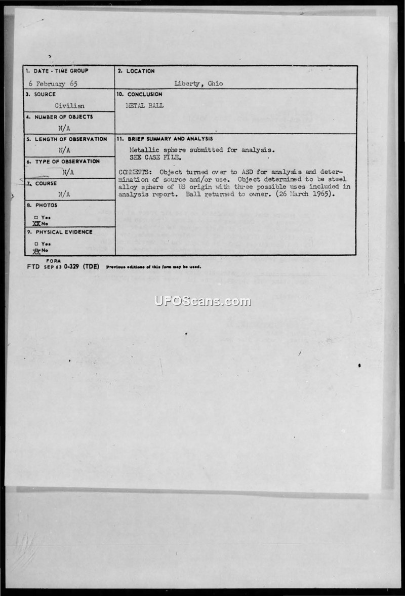 A metallic sphere found in Liberty, Ohio, was analyzed by the Air Force Materials Laboratory and determined to be an American-made aluminum casting with no evidence of space origin. The object was returned to its owner in March 1965.