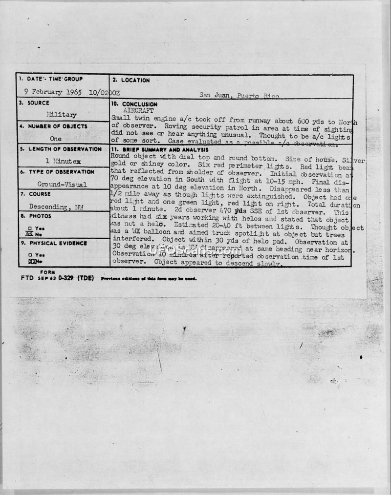Two military personnel reported a UFO sighting in San Juan, Puerto Rico, on February 10, 1965. The Air Force concluded the sighting was likely misidentified aircraft or urban lighting.