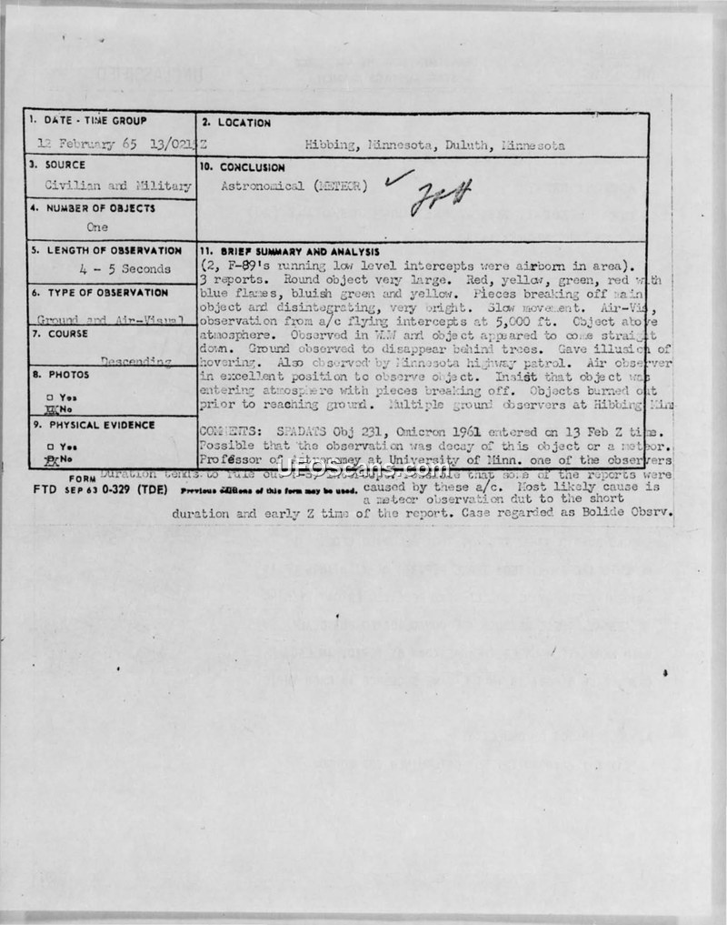 A 1965 Air Force report detailing multiple sightings of a large, disintegrating object over Hibbing, Minnesota. The official conclusion identified the object as a meteor or space debris.