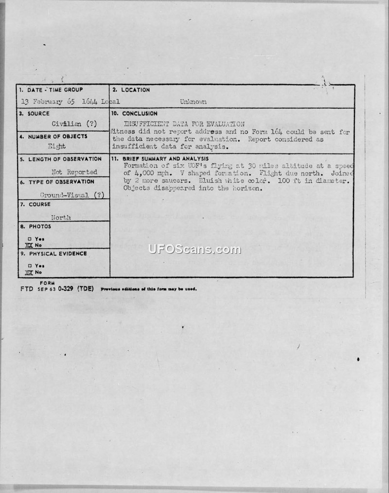 On February 13, 1965, at 16:44 local time, an unidentified witness reported observing a formation of unidentified aerial objects. The witness described an initial group of six objects flying in a V-shaped formation at an altitude of approximately 30 miles, traveling at a speed of 4,000 mph in a northerly direction. The formation was subsequently joined by two additional objects, bringing the total to eight. The objects were described as being bluish-white in color and approximately 100 feet in diameter, though the witness noted difficulty in estimating size at that altitude. The objects eventually disappeared into the horizon. The official evaluation by the FTD concluded that there was insufficient data to conduct a proper analysis, primarily because the witness failed to provide an address, which prevented the agency from sending a Form 164 to gather necessary follow-up information.