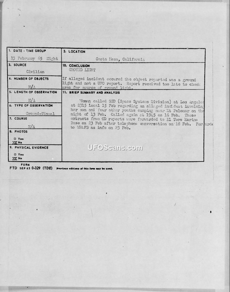 Unidentified Object Report — Costa Mesa, California, 13 February 1965