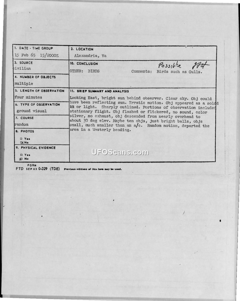 A 1965 sighting report from Alexandria, Virginia, detailing an observation of ten unidentified, silver, round objects. The official Air Force conclusion attributed the event to birds.