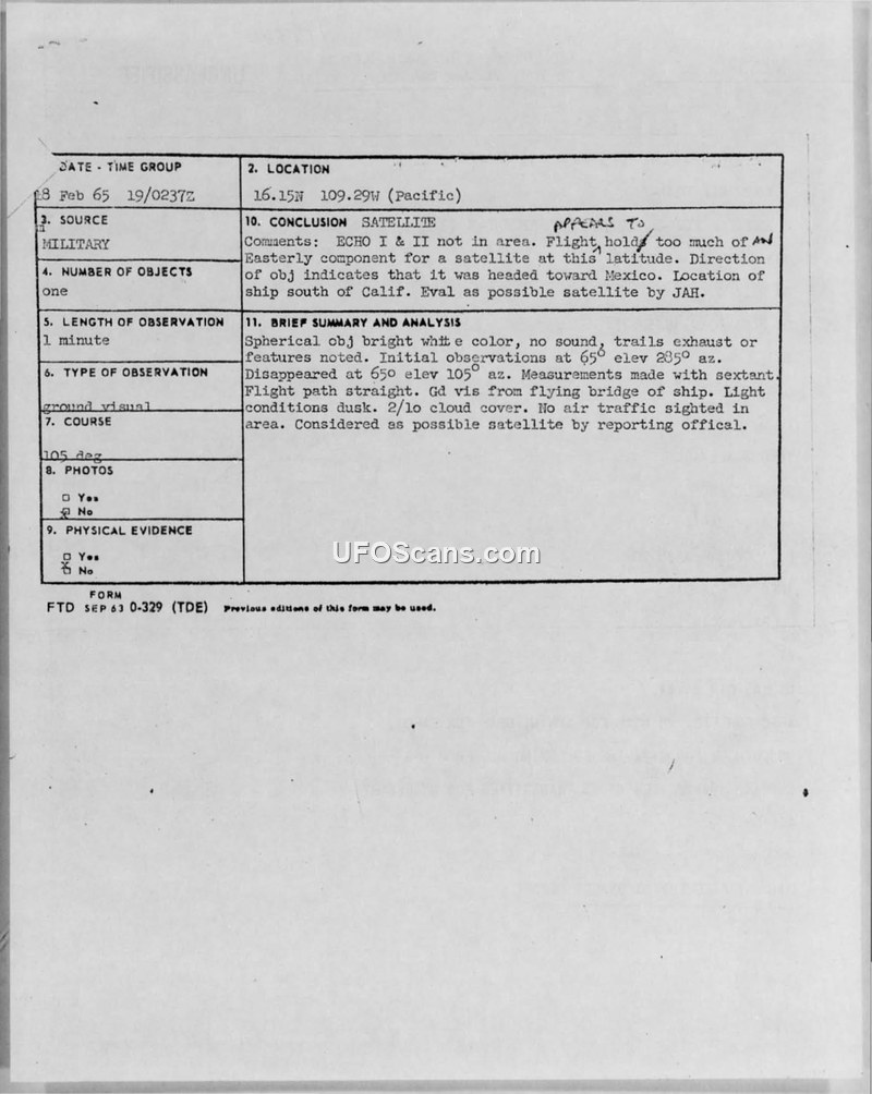 Unidentified Flying Object Report - USS Serrano - 18 Feb 65