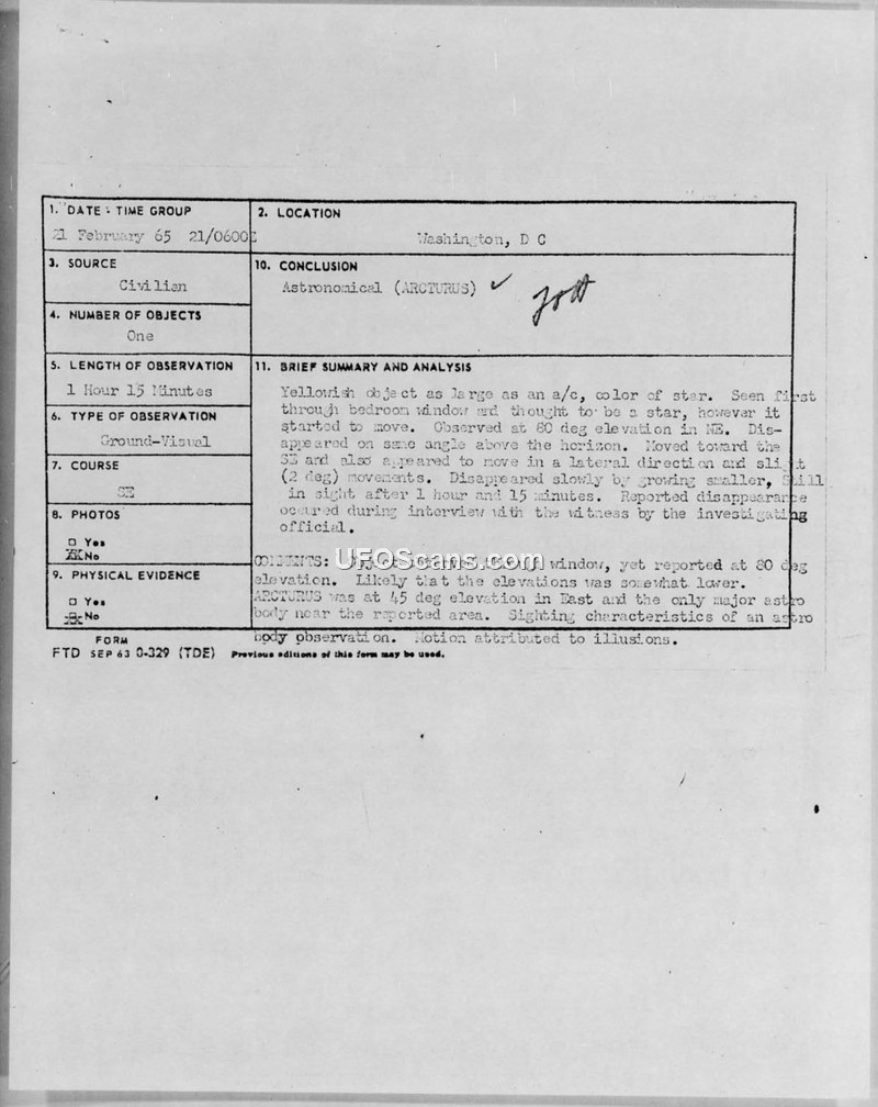 On February 21, 1965, a 33-year-old chemical engineer reported a sighting of an unidentified aerial object near Falls Church, Virginia. The witness, who was described by the investigating officer as sober and reliable, observed the object for one hour and fifteen minutes through a bedroom window. He initially mistook the object for a star, noting it was yellowish in color and appeared as large as an aircraft, though no specific shape was discernable. The witness reported that the object moved toward the southeast, performed lateral movements, and ascended slightly from an initial 80-degree elevation. The object was also described as moving in and out of clouds. The witness initially contacted the Virginia State Police, who then referred the matter to the 1001st Air Base Wing at Andrews Air Force Base. The duty officer, Captain Robert E. Raynor, Jr., attempted to locate the object but was unsuccessful. The investigation concluded that the object was likely the star Arcturus, which was positioned at a 45-degree elevation in the East at the time. The reported movement was attributed to optical illusions. Additionally, the report notes that a weather balloon had been released from Washington National Airport around the same time, which was observed by tower personnel at Andrews AFB, and the investigator suggested this might have been the source of the sighting.