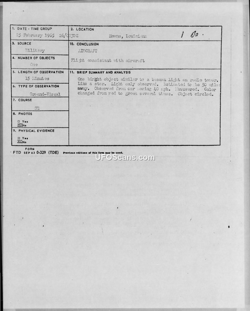 A civilian witness reported a maneuvering light in the sky over Houma, Louisiana, on 25 February 1965. Despite the object's unusual flight characteristics and lack of radar correlation, the Air Force concluded the sighting was consistent with aircraft.