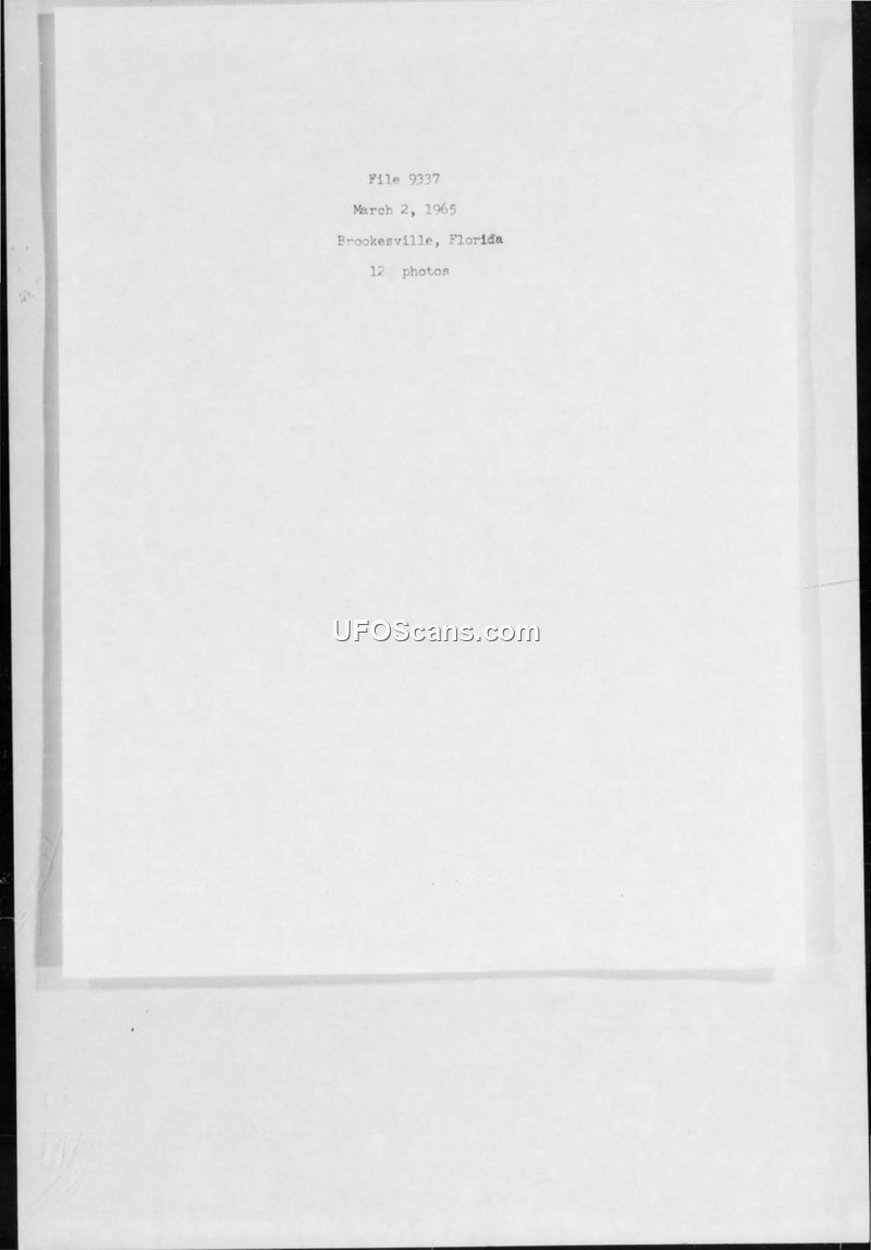 This document, identified as File 9337, consists of a cover page and eleven pages of photographic evidence related to an event in Brookesville, Florida, dated March 2, 1965. The cover page explicitly notes the file number, the date, the location, and the inclusion of 12 photographs. The subsequent pages contain black-and-white photographs showing a circular depression in sandy ground, as well as images of a person wearing a military-style uniform standing in a grassy, wooded area. No narrative text, witness statements, or official conclusions are provided within the document to explain the nature of the incident or the significance of the site depicted in the photographs.