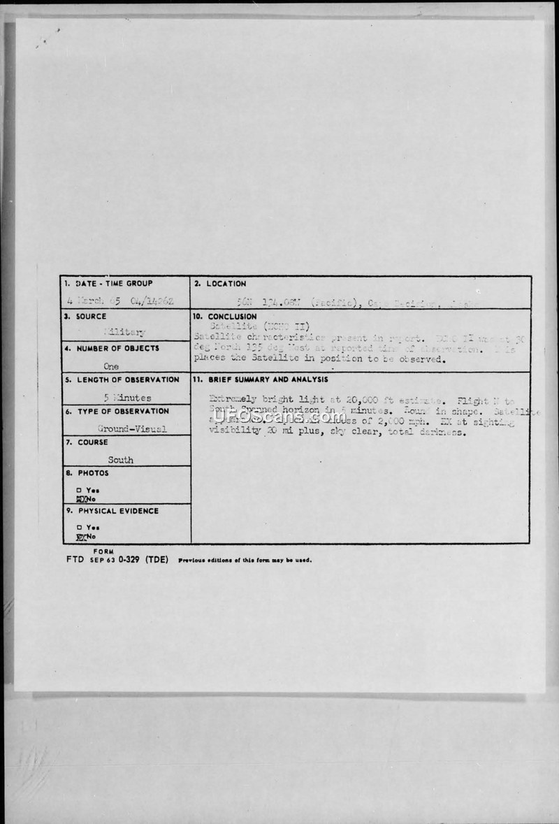 On March 4, 1965, at 1622Z, personnel at the Coast Guard Light Station at Cape Decision, Alaska, reported an unidentified flying object. The object was described as an extremely bright, round light with a satellite-like appearance. It was observed traveling from North to South, spanning the horizon in approximately five minutes. The estimated altitude was over 20,000 feet, and the speed was estimated to be in excess of 2,000 mph. Weather conditions at the time were reported as clear with total darkness, a ceiling of 4,000 feet scattered, and visibility of 20 miles or more. The report was transmitted via CIRVIS (Communication Instructions for Reporting Vital Intelligence Sightings) to various military commands, including CINCPACFLT and CINCNORAD. Subsequent analysis by the evaluating agency concluded that the object was the ECHO II satellite, noting that the satellite's position at 30 degrees North, 125 degrees West at the time of the observation aligned with the reported sighting.