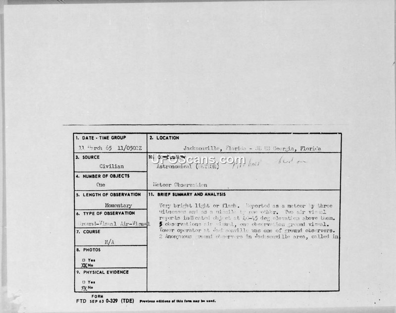 A bright light or flash was observed by multiple aircraft and ground personnel in Florida on March 11, 1965. The Air Force concluded the event was likely a meteorite or burning satellite.
