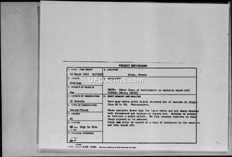 A 1965 UFO sighting report from Sloan, Nevada, was investigated by the Air Force. Photo analysis concluded the image was likely a photographic artifact caused by a drop of developer on the negative, rather than a genuine object.