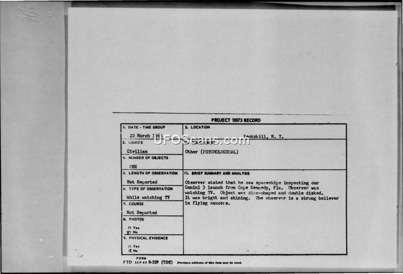 This document contains a collection of records related to a UFO sighting report from a civilian in Peekskill, New York, in March 1965. The primary report concerns an individual who claimed to have observed 'spaceships' inspecting the Gemini 3 launch while watching television. The observer described the object as disc-shaped and double-disked, bright and shining. The official Air Force conclusion for this incident was categorized as 'Other (PSYCHOLOGICAL).' The records include a Project 10073 record, a memorandum from the Department of the Air Force, and correspondence between the Foreign Technology Division and the observer. The investigating officer, Major Hector Quintanilla, Jr., noted that the observer was a 'strong believer in flying saucers' and was unwilling to accept the Air Force's standard explanations. The observer insisted that the government was keeping information secret and that the vehicles were extraterrestrial and under intelligent control. The file also contains a separate, unrelated letter from a boy in Lexington, Massachusetts, who requested information on UFOs after seeing a 'great big white light' on March 24, 1965. The Air Force responded to this request by providing standard information about Project Blue Book, stating that all reported aerial phenomena had been proven to be man-made, atmospheric, or celestial in origin. The document provides a clear view of the administrative process for handling civilian UFO reports during the mid-1960s, including the use of standardized questionnaires (FTD Form 164) and the dismissive stance taken by the Air Force toward reports from individuals they deemed to have psychological motivations or pre-existing beliefs in extraterrestrial phenomena.