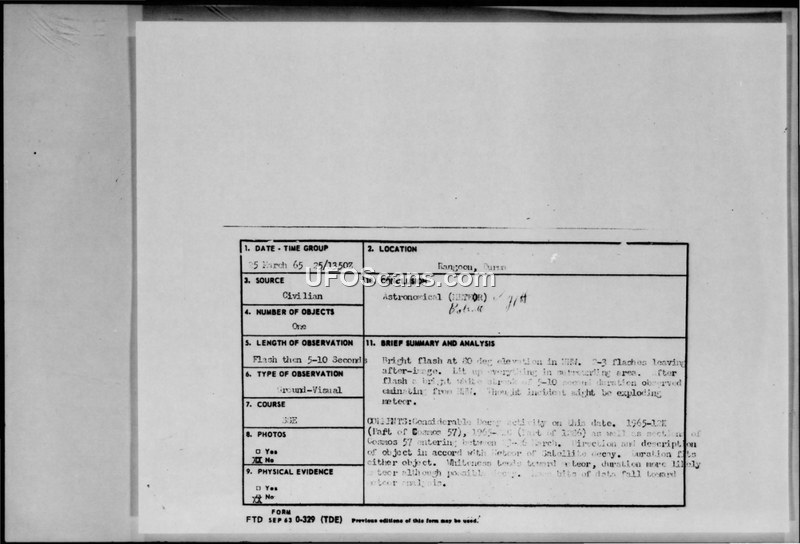 On March 25, 1965, at approximately 1350Z, a civilian USAID employee and a Japanese diplomat in Rangoon, Burma, observed an unidentified aerial phenomenon. The witnesses, who were sitting outside, reported a bright flash at an 80-degree elevation in the north-northwest. This initial event was followed by two or three additional flashes that left an after-image. The witnesses described a bright white streak that lasted for five to ten seconds. The entire episode was estimated to have lasted between ten and fifteen seconds. The witnesses initially speculated that the incident might have been an exploding comet. Official analysis conducted by the Foreign Technology Division (FTD) concluded that the sighting was likely astronomical in nature, specifically a meteor or the decay of satellite debris. The report notes that there was considerable decay activity on that date, specifically citing the reentry of sections of Cosmos 57 between March 20 and March 26, 1965. The direction and description of the observed object were found to be in accord with satellite decay.