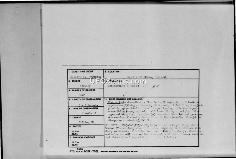 On 27 March 1965, at approximately 0123Z, the crew of a B-52 aircraft flying at 35,000 feet observed four bright white, circular objects while positioned 50 miles south of Albany, New York. The objects, described as being about the size of a quarter, appeared in a trail formation and were observed falling in a hyperbolic arc for a duration of three to five seconds before disappearing abruptly at an altitude of approximately 45,000 feet. The pilot, Captain Bernard Roque, and co-pilot, 1st Lieutenant Roger Poore, both of the 397th Bomb Wing, reported the sighting. While the pilot initially suspected the objects were space debris or a space vehicle on re-entry, the co-pilot, having witnessed rocket re-entries previously, noted that these objects did not behave in the same manner. The incident was reported through military channels, including the 416th Bomb Wing and the 397th Bomb Wing, to the Foreign Technology Division. The official conclusion recorded for the sighting was that the objects were meteors. The reporting officer, Captain Robert D. Shular, indicated that he was unable to conduct a further investigation due to his current duties.