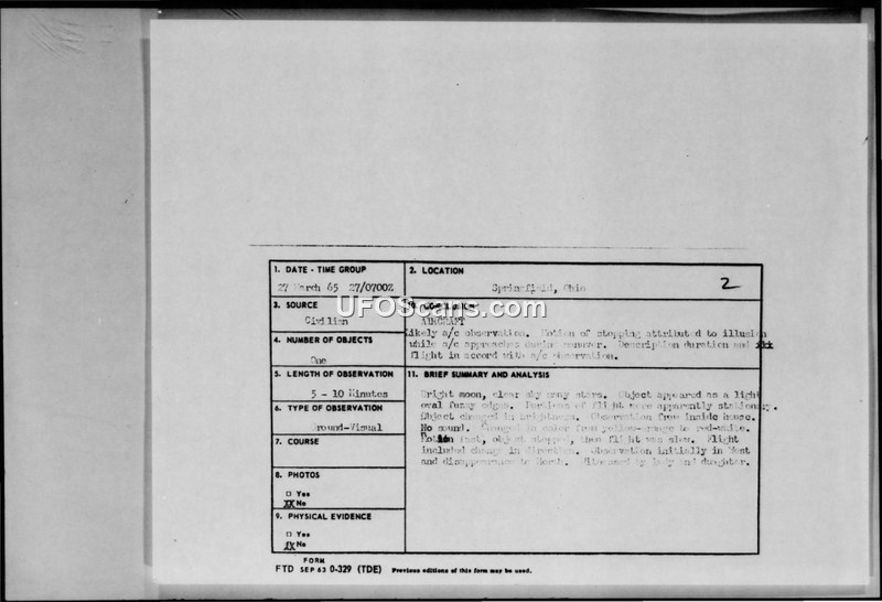 A 1965 U.S. Air Force report detailing a sighting of an unidentified light in Springfield, Ohio. The Air Force concluded the object was an aircraft, attributing the observed movement to an optical illusion.