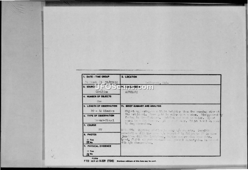 This document contains a Project Blue Book sighting report regarding an unidentified aerial phenomenon observed on March 30, 1965, near Bellbrook, Ohio. The witness, a local farmer, reported observing a bright, oval-shaped object, approximately three times the size of the largest star, moving from East to West before turning North. The witness described the object as gold to red in color and silent. The observation lasted between 10 and 12 minutes. The witness contacted the Foreign Technology Division at Wright-Patterson Air Force Base after reading about similar sightings in the Lewisburg, Ohio area in the news. Captain Carl N. Schaffhauser documented the initial report, and Major Hector Quintanilla, Jr., Chief of Project Blue Book, subsequently sent a formal letter to the witness requesting the completion of an FTD Form 164. The official conclusion reached by the Air Force for this incident was that the object was an aircraft.