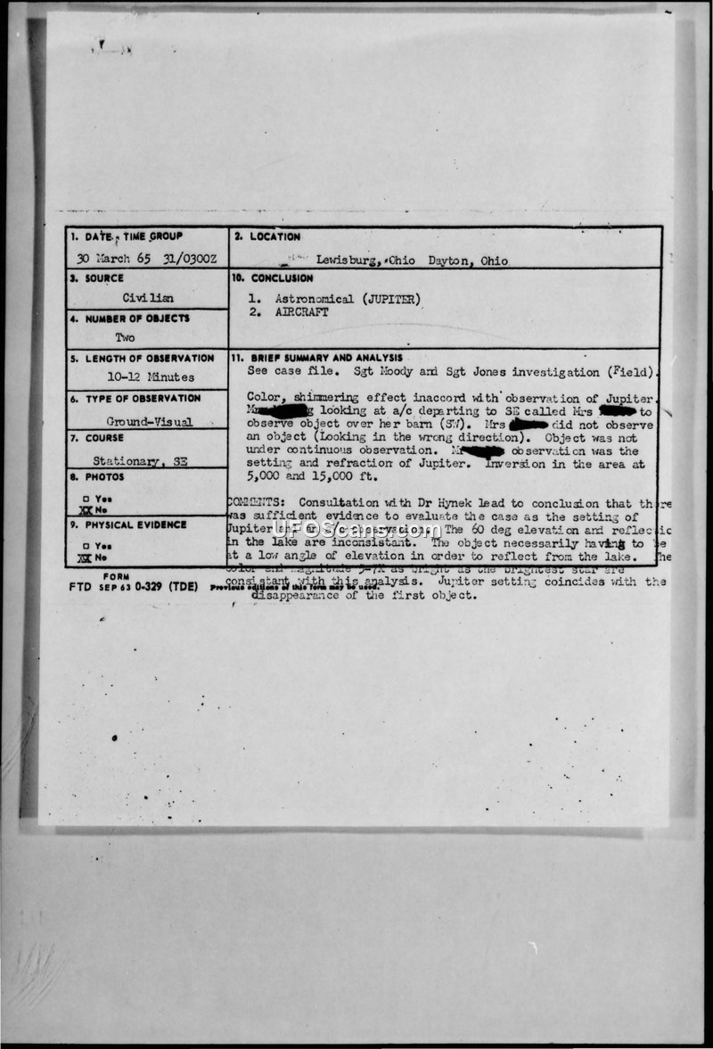 Multiple witnesses in Lewisburg, Ohio, reported a bright, golden, stationary object on March 30, 1965. The Air Force investigation concluded the sightings were likely the planet Jupiter and aircraft.