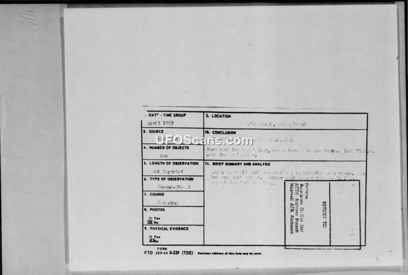The Air Force requested further information via FTD Form 164 regarding a hovering object sighting in Pittsburgh, Pennsylvania, in April 1965, as the initial report provided insufficient data for evaluation.