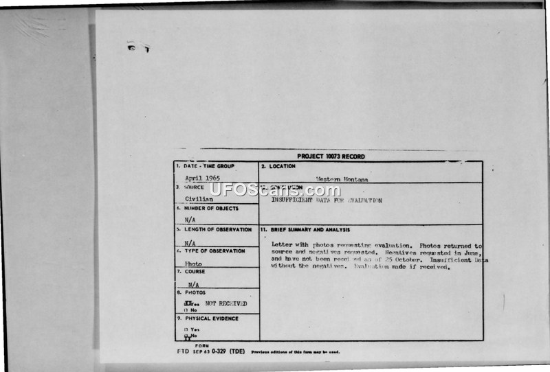 The Air Force requested the original negatives from the source in June 1965 to conduct an analysis. As of 25 October 1965, the negatives had not been received, rendering the case impossible to evaluate.