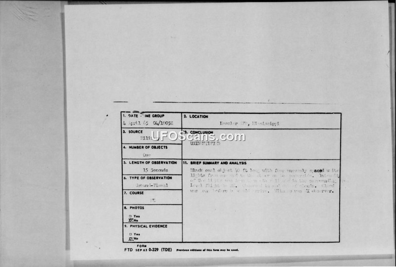 On 4 April 1965, at approximately 0405 CST, an Airman Second Class (A2C) serving as a weather observer at Keesler Air Force Base, Mississippi, reported an unidentified aerial phenomenon. The witness described a black, oval-shaped object, estimated to be 40 feet in length, resembling a football. The object featured four high-intensity white lights evenly spaced along its underside. The witness observed the object moving in level flight from the southwest toward the northeast, passing below a cloud layer situated at 1,200 feet. The object was described as moving fast, with no audible sound, trail, or exhaust. The total duration of the sighting was estimated at 15 to 20 seconds. The witness, who was initially shaken by the event, first suspected the object was an aircraft and contacted the Federal Aviation Administration (FAA), which confirmed there were no aircraft in the area at that time. Dr. J. Allen Hynek, a prominent investigator of aerial phenomena, conducted an interview with the witness to re-enact the sighting and verify the details. Various conventional explanations were considered and subsequently dismissed: a balloon was ruled out because the object moved cross-wise to the wind; searchlight reflections were discounted as the witness noted the object was distinct from known light reflections in the area; and satellite sightings were ruled out due to the object's low altitude and the presence of four lights rather than one. A separate report from the Naval Air Station at Ellyson noted that two naval air cadets had observed a 'ball of flame' approximately one hour earlier, though the relationship between these events remained unconfirmed. Ultimately, the Air Force's Aerial Phenomena Branch concluded that the available information was insufficient to provide a definitive explanation, and the case was officially classified as 'UNIDENTIFIED'.