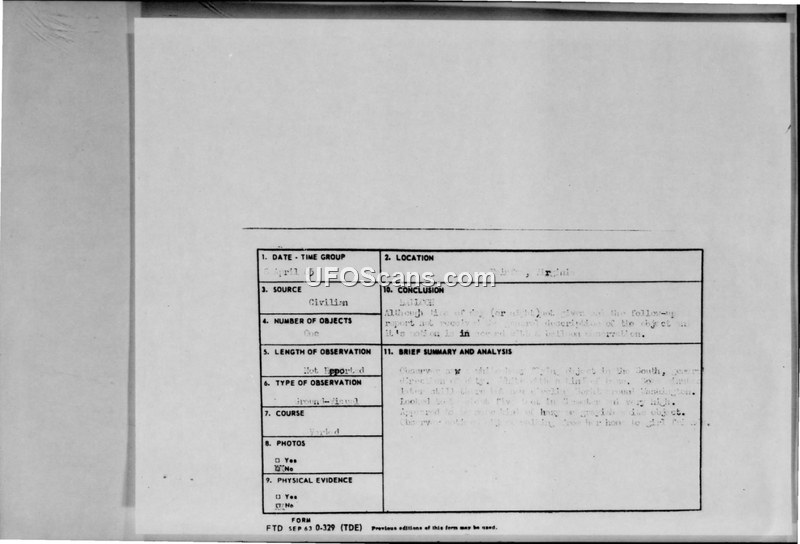 Sighting Incident Report — Fairfax, Virginia, 8 April 1965