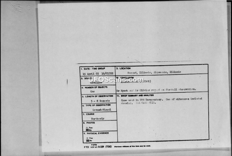 A civilian sighting of a bright object on April 15, 1965, in Illinois was investigated by the Air Force and evaluated by the American Meteor Society. The official conclusion reached by consultants Dr. Hynek and Dr. Olivier was that the object was a meteor.