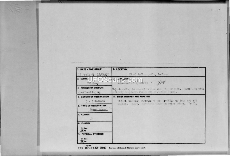 UFO Sighting Report — Indianapolis, Indiana, 16 April 1965